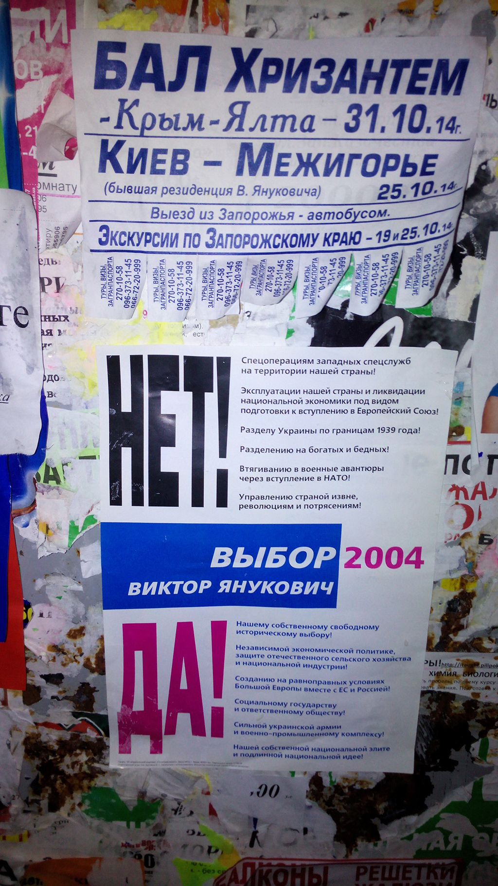 На рекламных местах в Запорожье кто-то расклеил листовки за Януковича. Наш читатель проходил в районе Бабурки и прислал фотографии. Сначала мы не поверили и подумали, что это розыгрыш. Однако присмотрелись и поняли - фотографии действительно свежие.