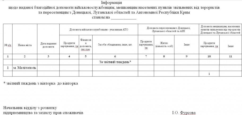 Об этом в соцсети пишет возмущенная волонтерка Светлана Алексеева: «Мелитопольских волонтеров обязывают отчитываться от вторника до вторника по форме, разработанной исполкомом».