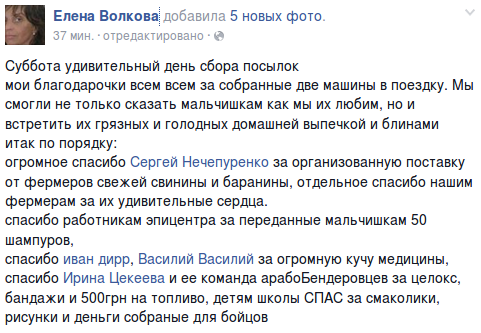 Об очередной поездке в зону АТО в соцсети пишет волонтерка Елена Волкова.