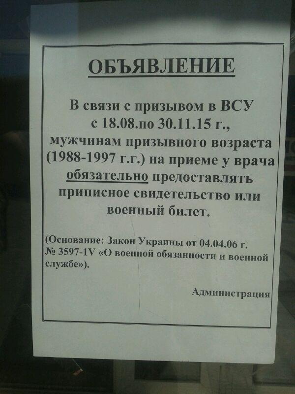 Жители Энергодара мужского пола и призывного возраста — от 18 до 27 лет обязаны ходить на прием к врачу только с военным билетом или приписным свидетельством.