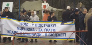 Люди из одной группы держат в руках флаги с символикой ВО «Свобода», государственные флаги Украины и один флаг «Правого сектора». Они также держат транспаранты с лозунгами: «Правительство — в отставку!», «Яценюка — за решетку!», «Ворованные миллиарды — в бюджет!».