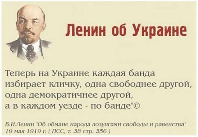Несмотря на снесённые по всей Украине памятники Ленину, прогнозы Ильича в отношении Украины, как говорится, живут и побеждают. Возможно, именно это стало причиной потешной декоммунизации и «ликвидации» любых намёков на ленинские учения? Напомню, говоря о характере контрреволюционных мятежей на Украине, вождь мирового пролетариата указывал на их «зависимость» от заграничных идеологов, а также отмечал, что неизменным спутником мятежей стал бандитизм.